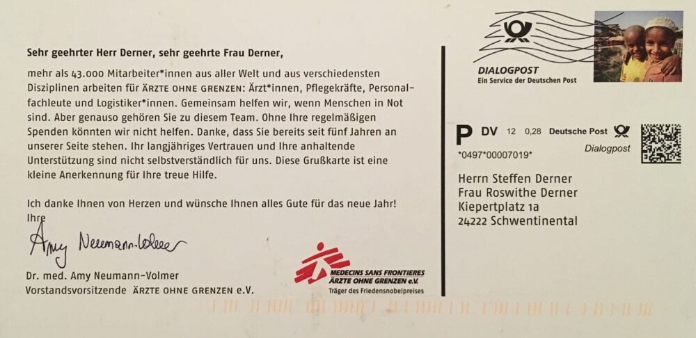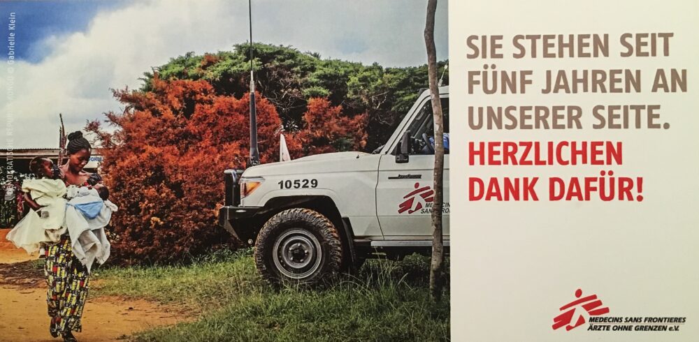 That’s why I’m promoting here for the support of „Médicines sans Frontières“, as they are called in the French original.