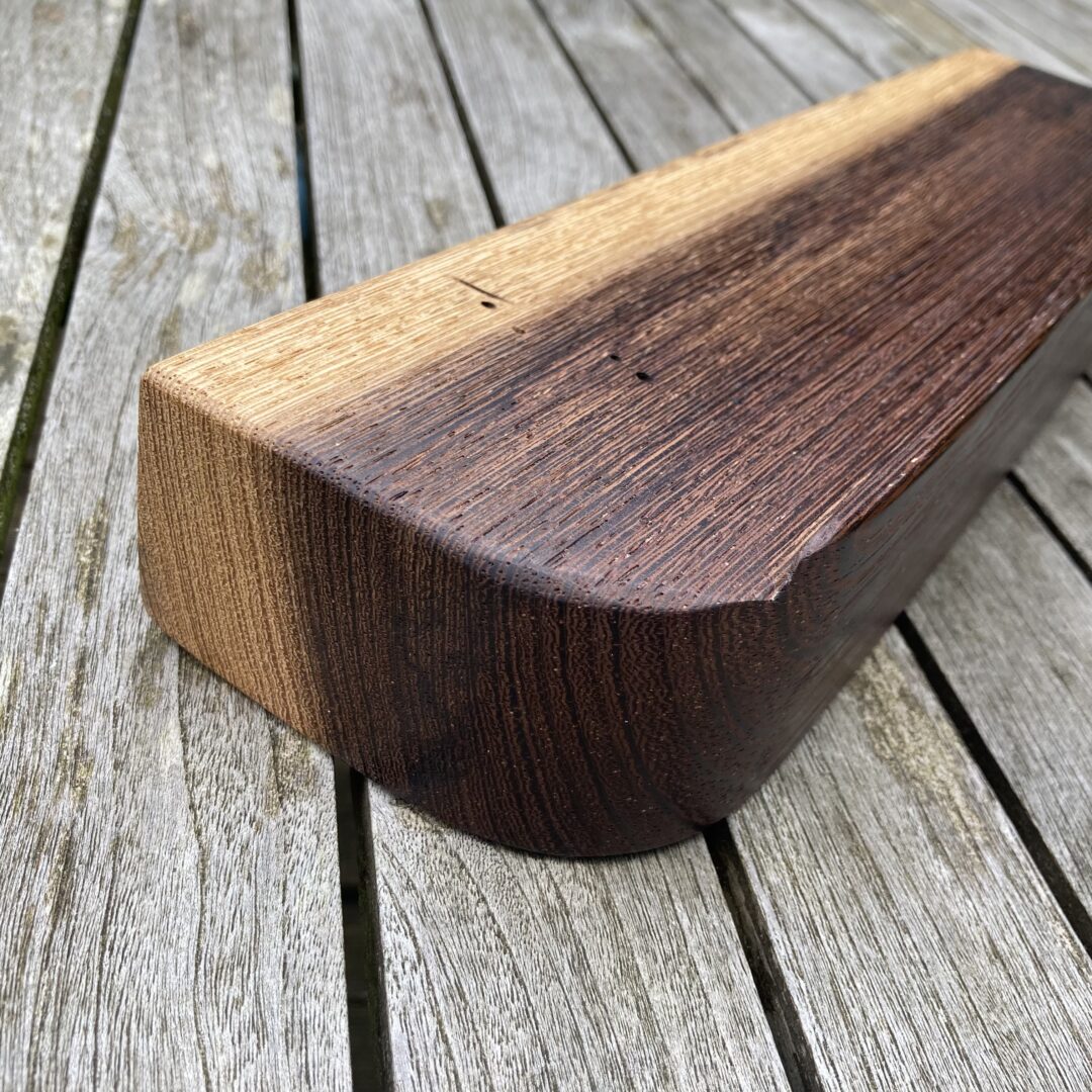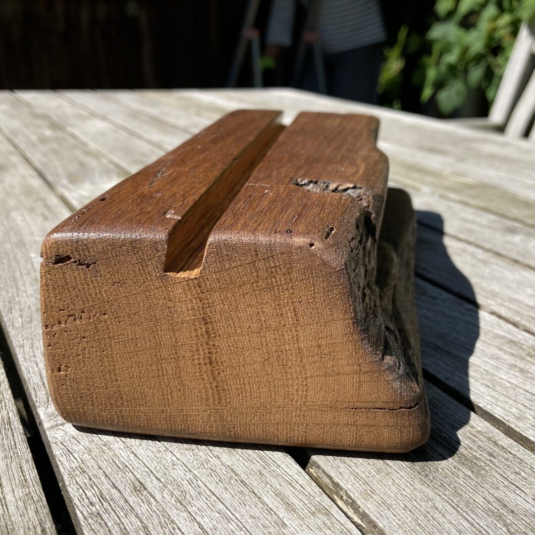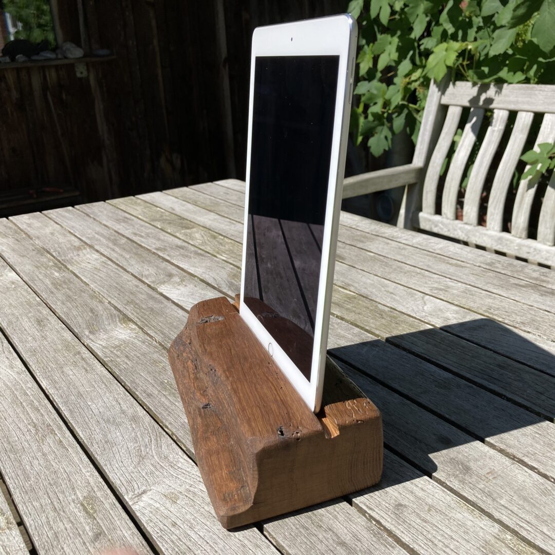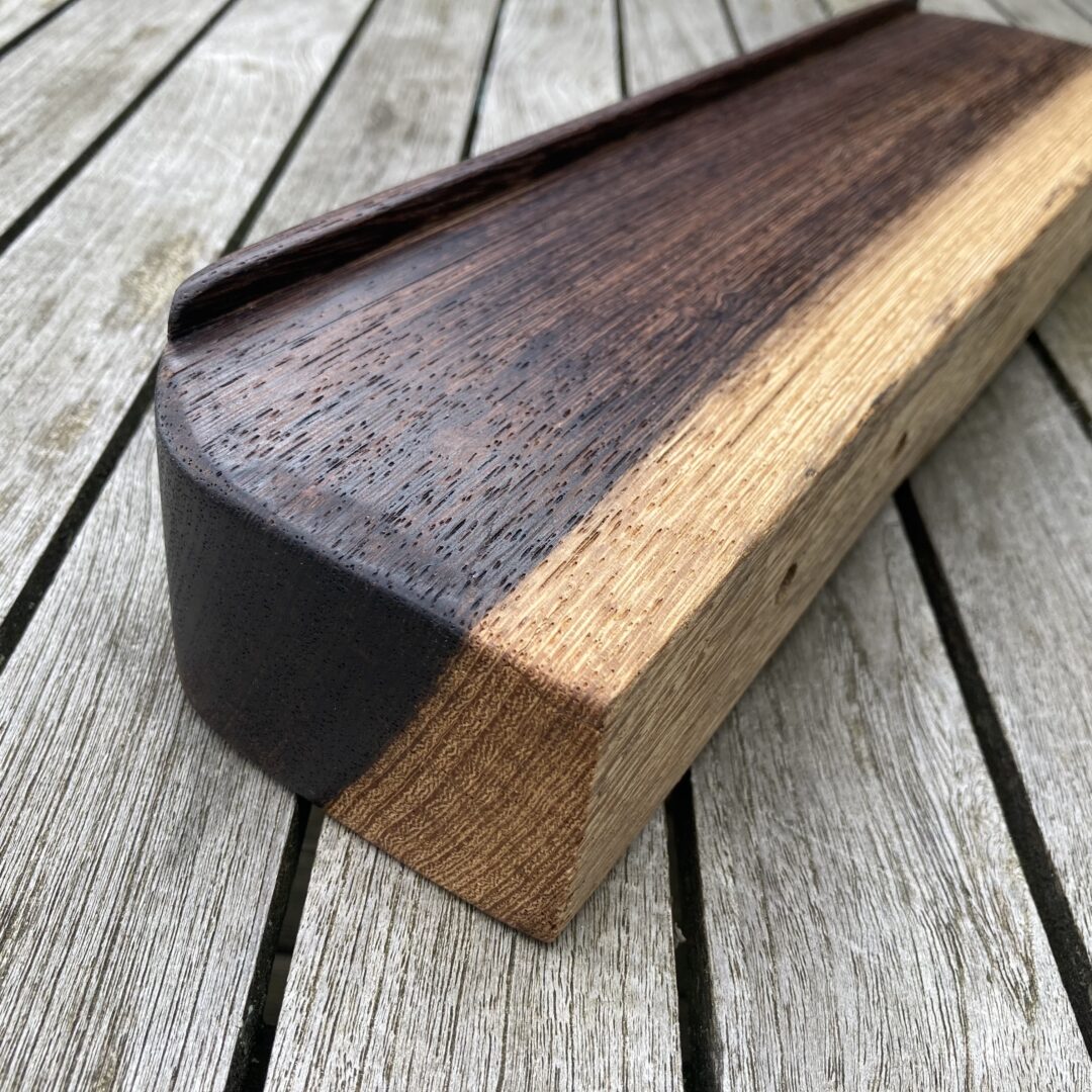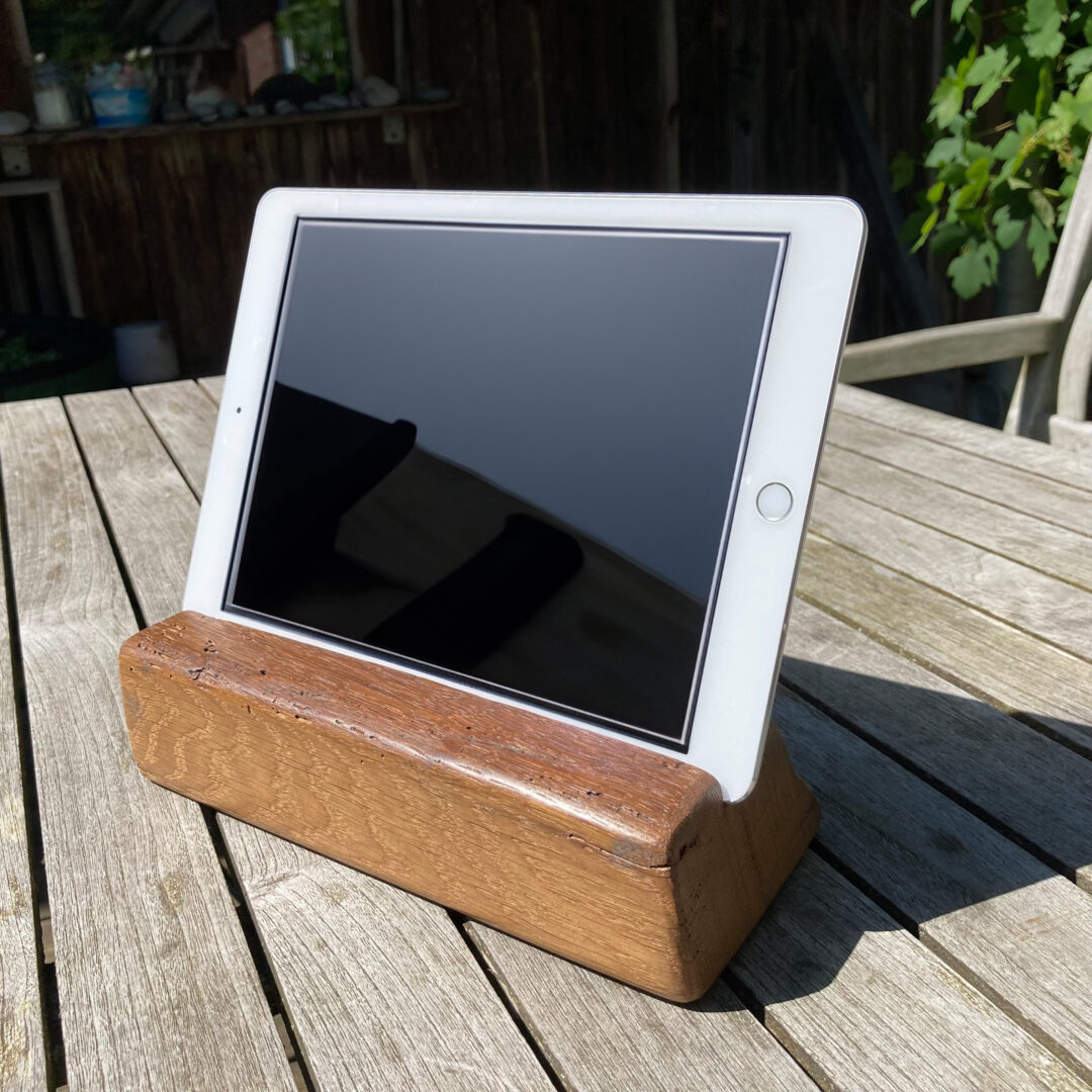 #4: Wandregal Wenge 410 x 100 x 50 mm Aus geerbter Bohle von Vaters Dachboden (enthalten: 2 Stockschrauben und 2 Dübel zur Befestigung an der Wand) geölt und gewachst (Auro) von links von hinten von vorn Anwendungsbeispiel (mit längerem Teil der Bohle) von rechts von oben von unten #1: Tablet-Halter Eiche 228 x 110 x 60 mm, Nut 9 mm ehemals Scheunenbalken Teilweise (hinten) alter Zustand erhalten Nimmt alle gängigen Tablets in waagerechter und senkrechter Position auf geölt, gewachst (Auro) waagerecht rechts links senkrecht. „falsch“ rum drin. geht auch.