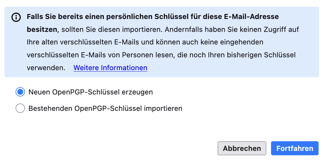 Weiter geht’s mit „Fortfahren“, um einen neuen Schlüssel (das heißt eigentlich: ein Schlüsselpaar) zu erzeugen.