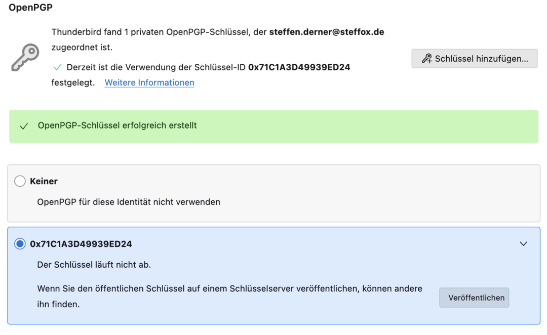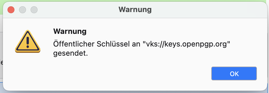 Mit einem Klick auf „Veröffentlichen“ wird Dein ÖFFENTLICHER Schlüssel an openpgp.org geschickt. Dein PRIVATER Schlüssel bleibt geheim.